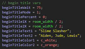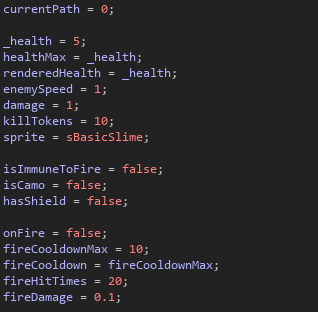 This event inside the slime object initialises the variables for the slime. This includes health, speed, damage, kill tokens, the sprite, and other Booleans used for Immunity to fire damage, has camouflaged and has shield.