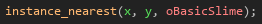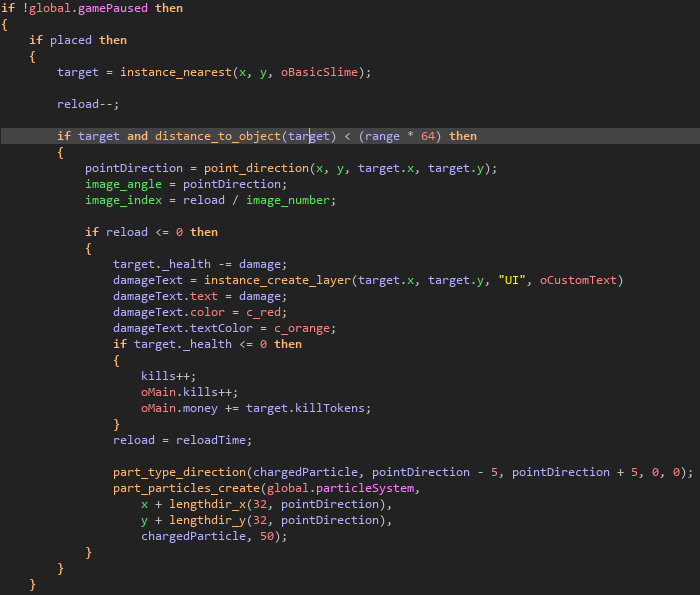 Firstly, I needed a way of getting the object index of the nearest slime to the tower, so I chose to use the instance_nearest() function which returns the index of the slime object.