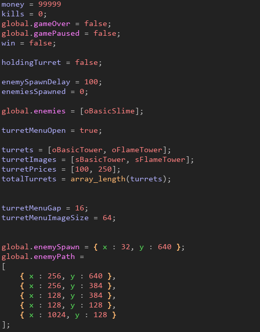 The create event sets up the local variables for the game, including money, kills, game over and game paused Booleans, if holding a tower, the enemy spawn delay, total enemies spawned, and finally the variables for the turret menu.
