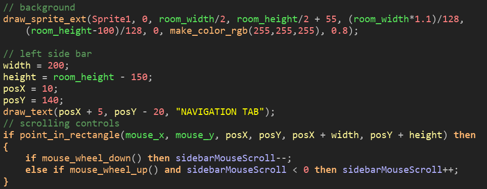 This code manages the setup variables and drawing of the navigation menu and controls the logic of the scrolling.