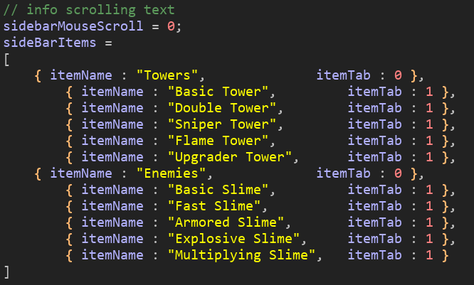 - An information menu, which will have all the information for that Tower or Slime under it. This menu will have a scroll function, so the player can scroll through the information like a web page