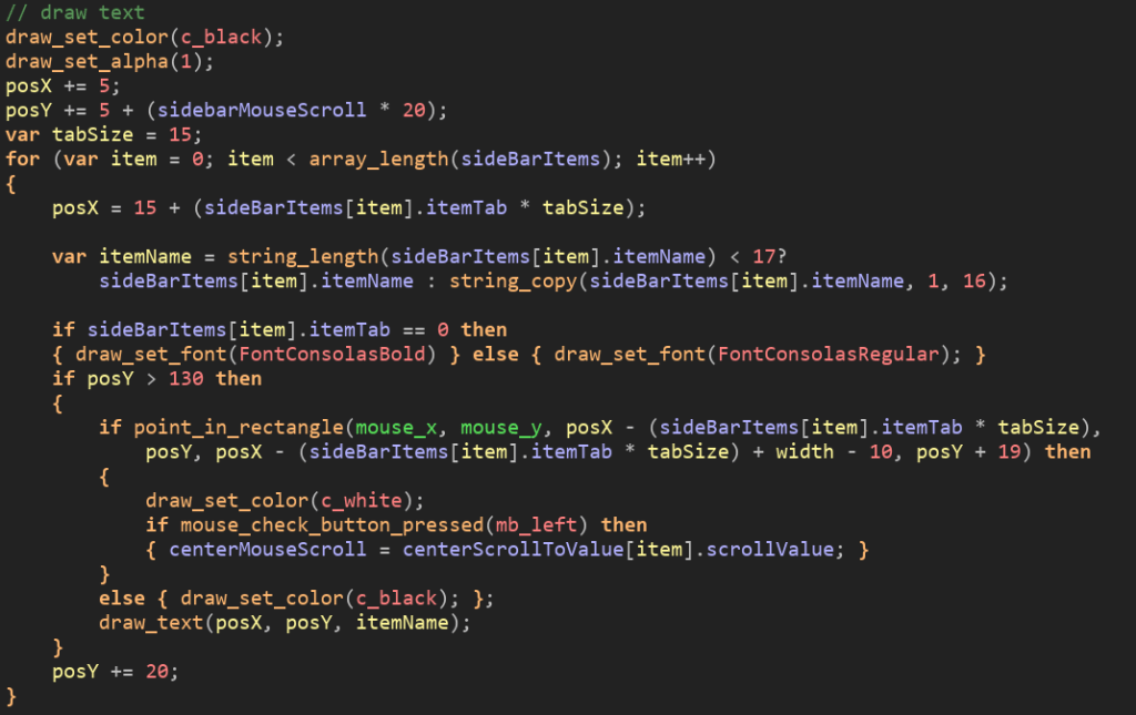 This code is responsible for positioning, aligning, and drawing the text onto the screen and the logic for clicking to go to that section.