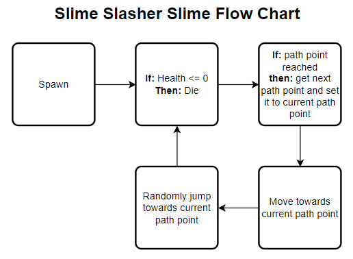The slime flow chart below shows the process of the slime. These are the basic instructions that the slime will follow, ignoring customisable and visible processes, this just shows the logic alone.