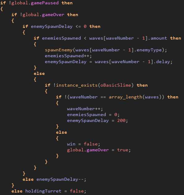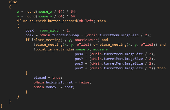 The last section of the step event is for controlling the placement logic. When a tower is selected in the Tower Menu, it spawns at the mouse’s position and can be placed by pressing the left mouse button. I used the place_meeting() function to return a collision between the tower’s position and the specified object – if there are no collisions between other towers, then the tower can be placed.