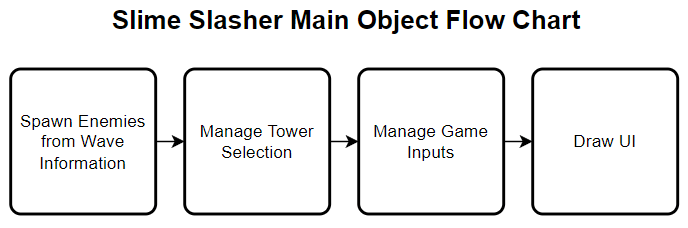 The main object controls the main functions of the game, such as enemy wave spawning and tower placement. This object also draws the in-game UI and manages the controls and logic of the game. This is the basic flow chart for the main object: