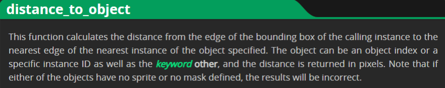 GameMaker Manual (yoyogames.com) | distance_to_object()