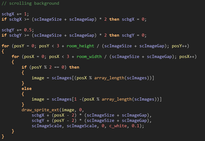 I faced the challenge of implementing the scrolling background into the game because there were so many variables to consider, such as the scroll speed, direction, start position, loop points, image scale, and image gap. I was able to solve this by experimenting with different values for these variables and adjusting them until the background looked good and moved smoothly.