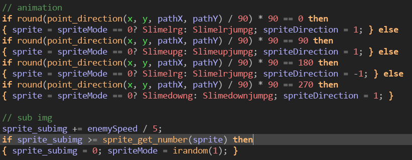 During this, I had the idea to randomise if the slime was jumping or walking and created a quick random variable assignment after each animation was finished.