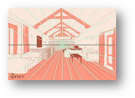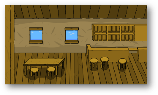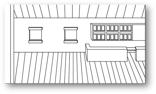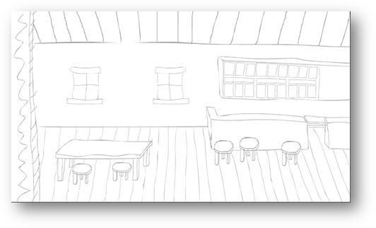 ⬆️ This sketch is a good starting point for the level design. I tried to create a 3D perspective effect using the floorboards and roofing. I used these images below as reference points, although I could have used them better. I have found that perspective is a difficult effect to create, especially if you are working with objects that are not aligned perfectly – for example, the table.