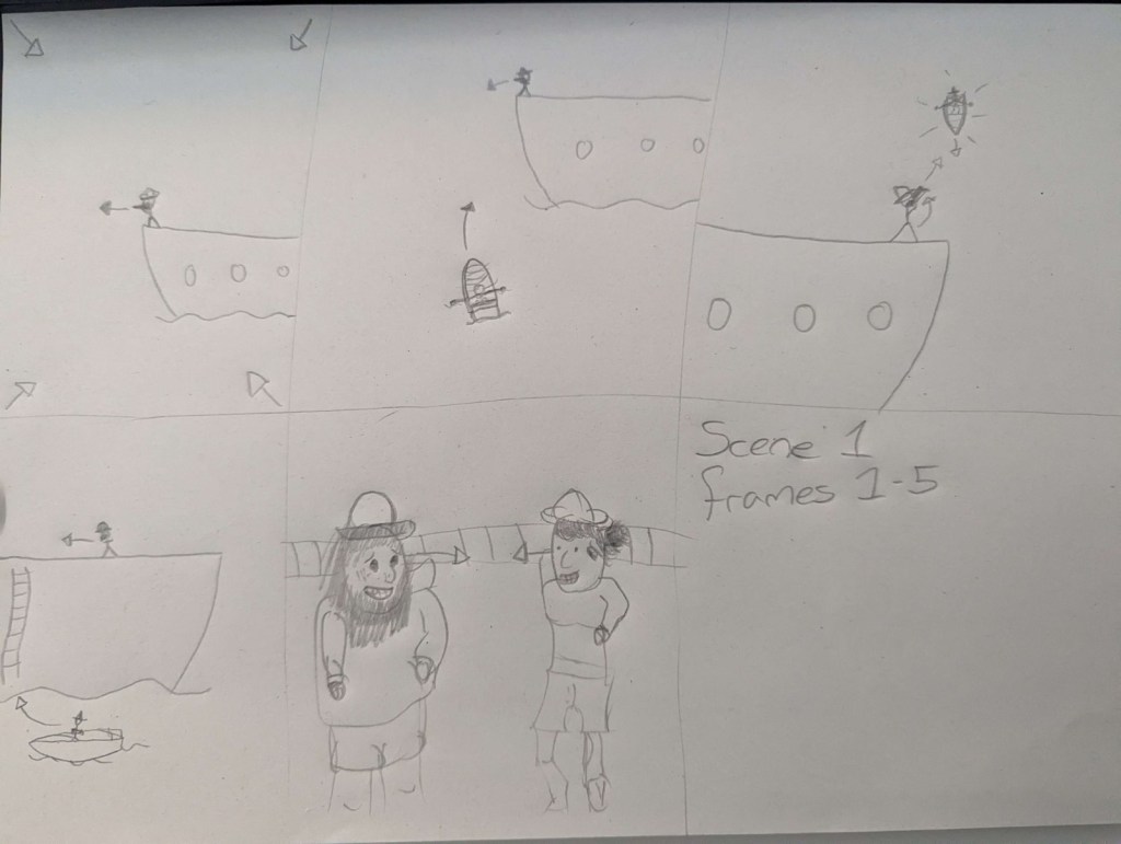 I have produced a story describing scene 1, split into 4 storyboards each with 5 frames.