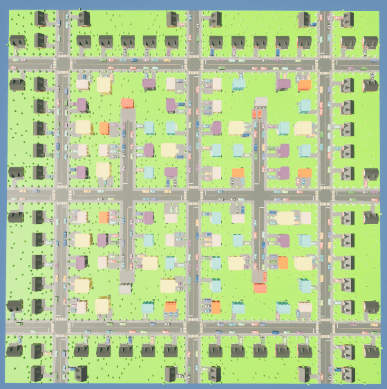 Notice how the outside road tiles have no cars parked on the approach to where the intersection would connect, I made this decision to imitate real life, where cars are not allowed to be parked near intersections.