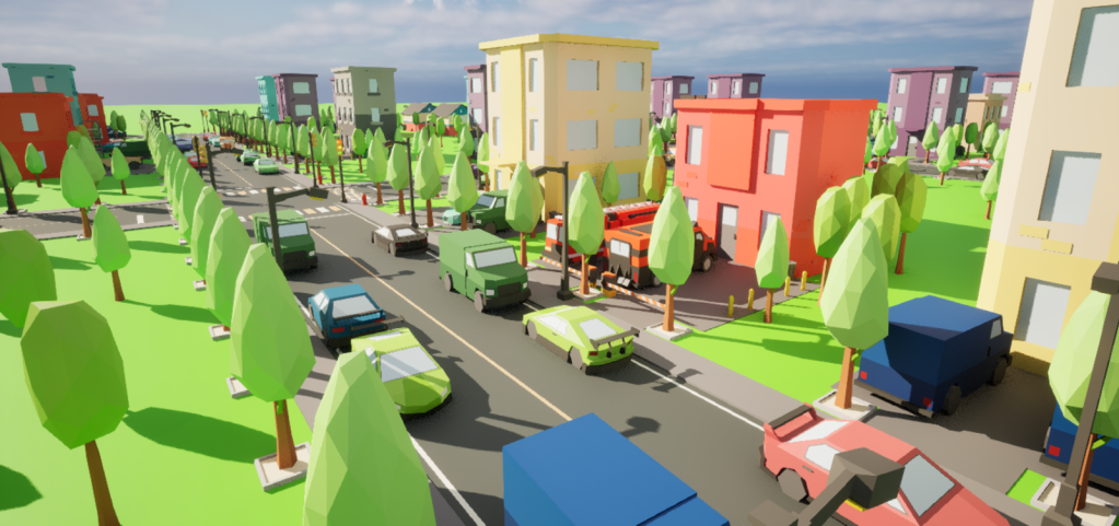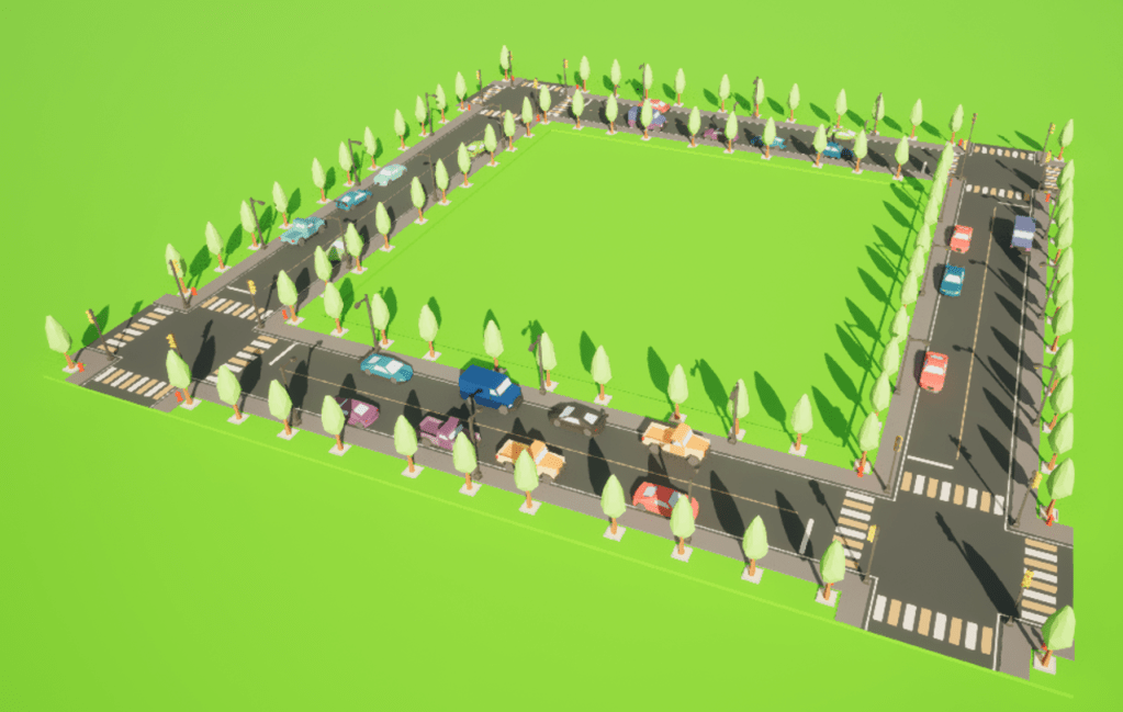 These road tiles connect well together. Each car is procedurally spawned alongside the curbs – not too close to intersections or other cars.