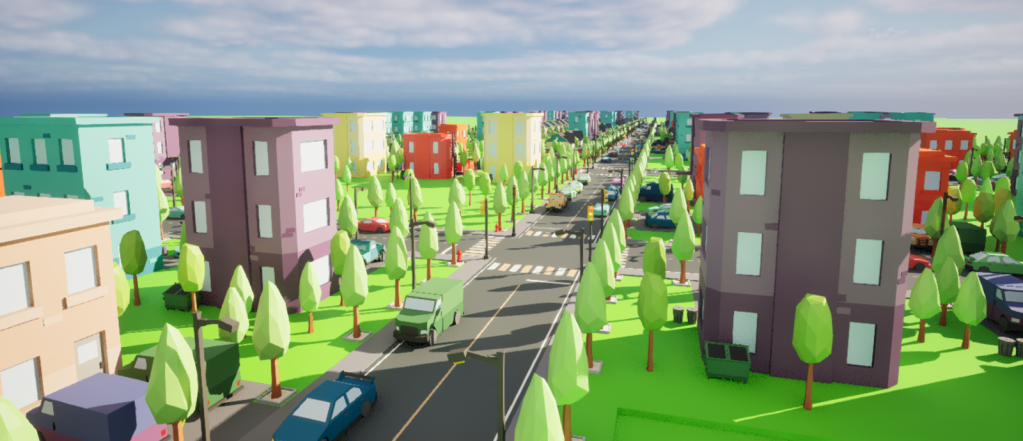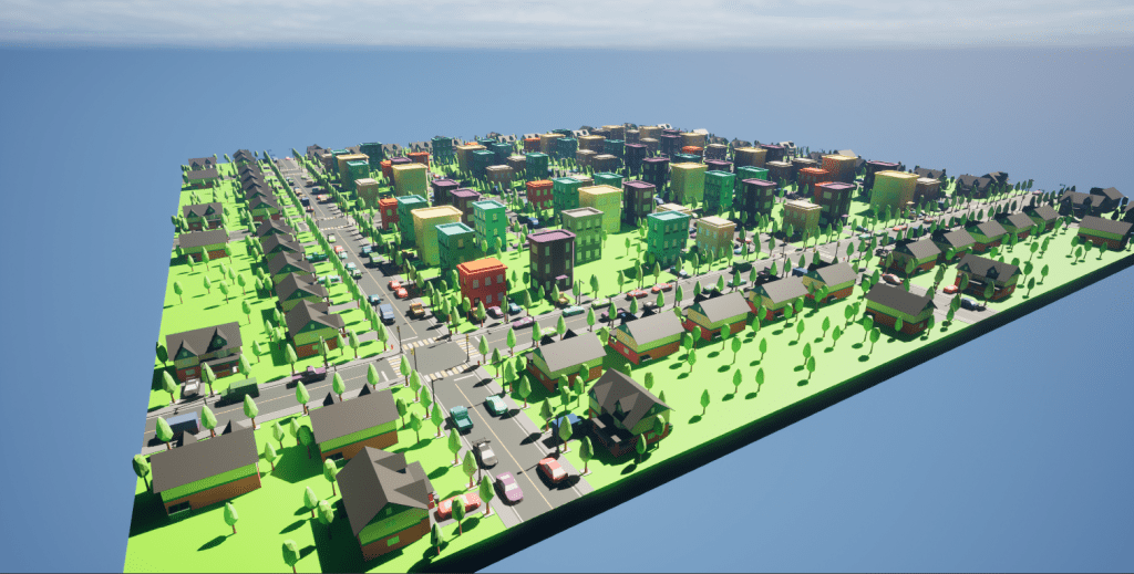 Here are some screenshots of an example city I made by hand. It was made in just a few minutes thanks to the procedural element of each building, all I had to do was drag some tiles from the Content Browser and drop them into the world.