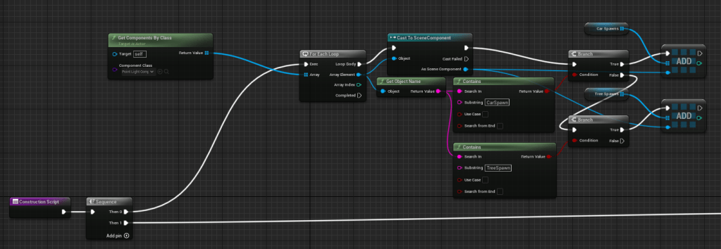 Today, I reworked all the tiles to collect all the CarSpawns and TreeSpawns within the actor and add them to arrays to be used when spawning the assets procedurally. I did this because I needed to change something in the procedural part, however it would be VERY time consuming to replicate it to the other tiles as it requires ALOT of modifications. Instead, I reworked how the CarSpawns and TreeSpawns are defined. Before, I would have to manually drag in the reference to each CarSpawn and TreeSpawn, but with the following blueprint, I can collect them into arrays without any manual input at all, essentially automating the entire process and allows for the same construction script to execute for all tile blueprints.