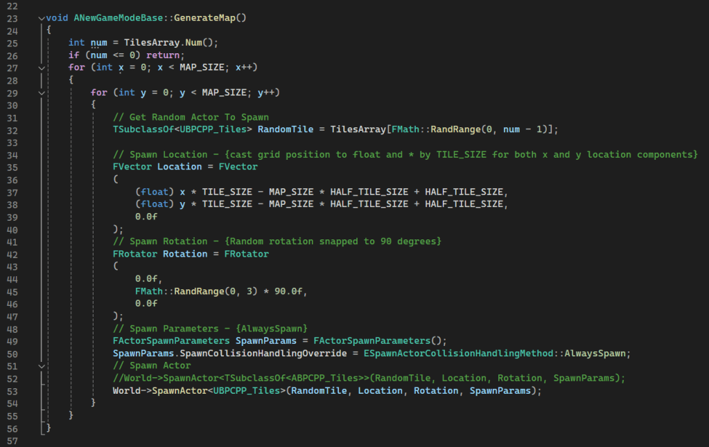 To show my knowledge off, I wanted to get a head start with the procedural aspect to my game. I wrote some code inside the GameModeBase C++ Class to generate an n-by-n grid of <ABP_Tile> actors
